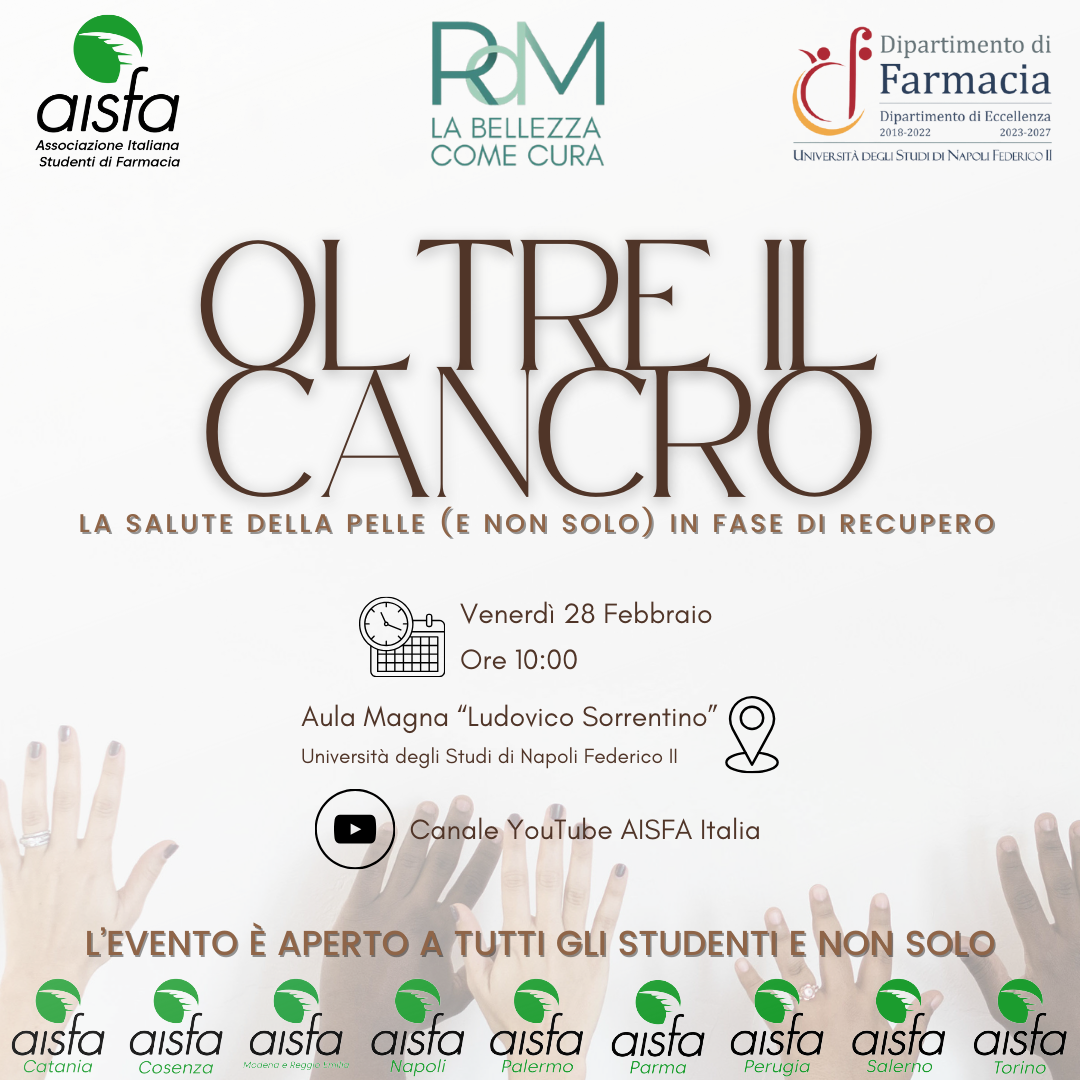 Venerdì 28 febbraio dalle ore 10:00 alle 12:30 si svolgerà presso l'Aula Magna LudovicoSorrentino del Dipartimento di Farmacia l'evento OLTRE IL CANCRO: la salute della pelle (e non solo) in fase di recupero